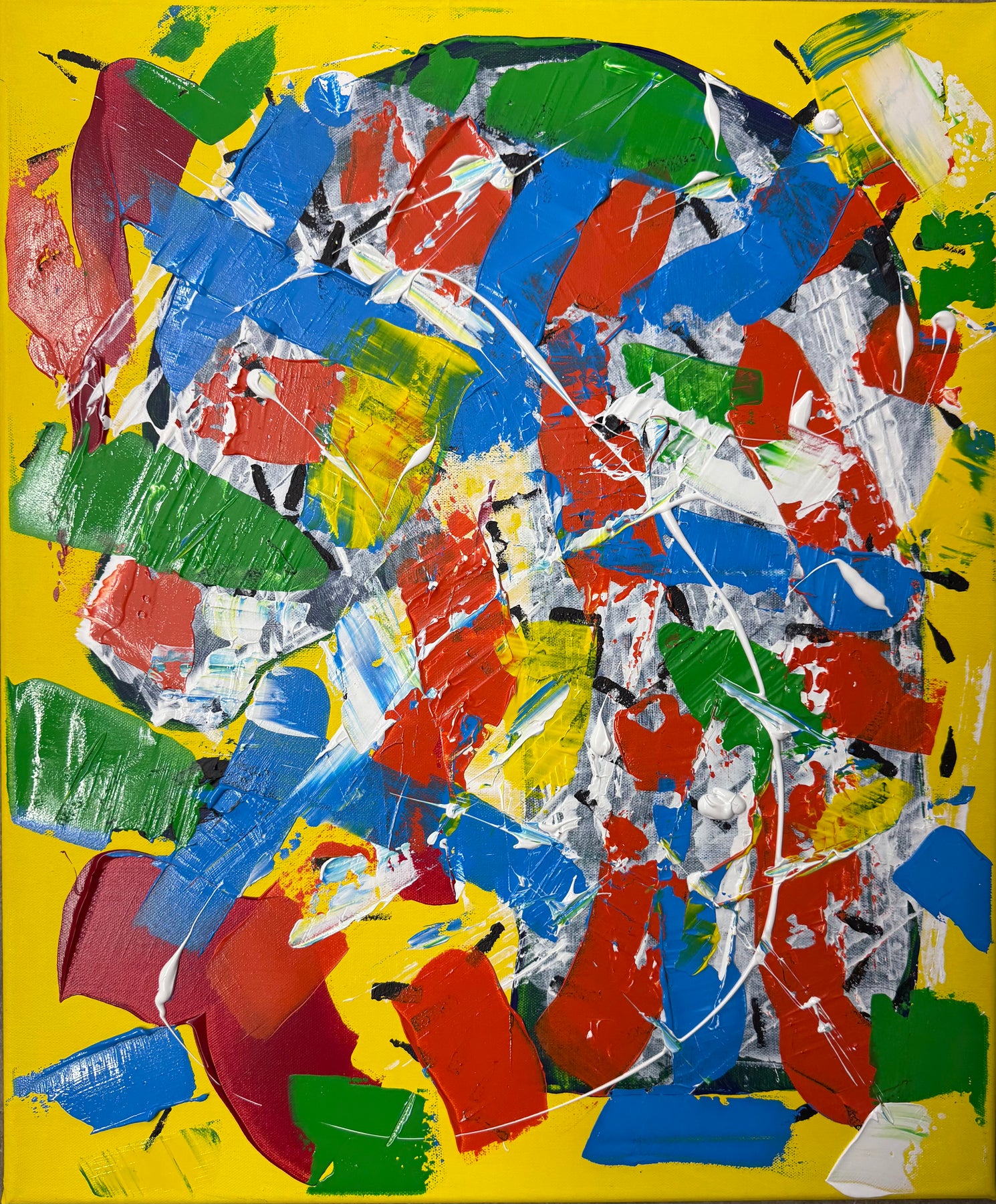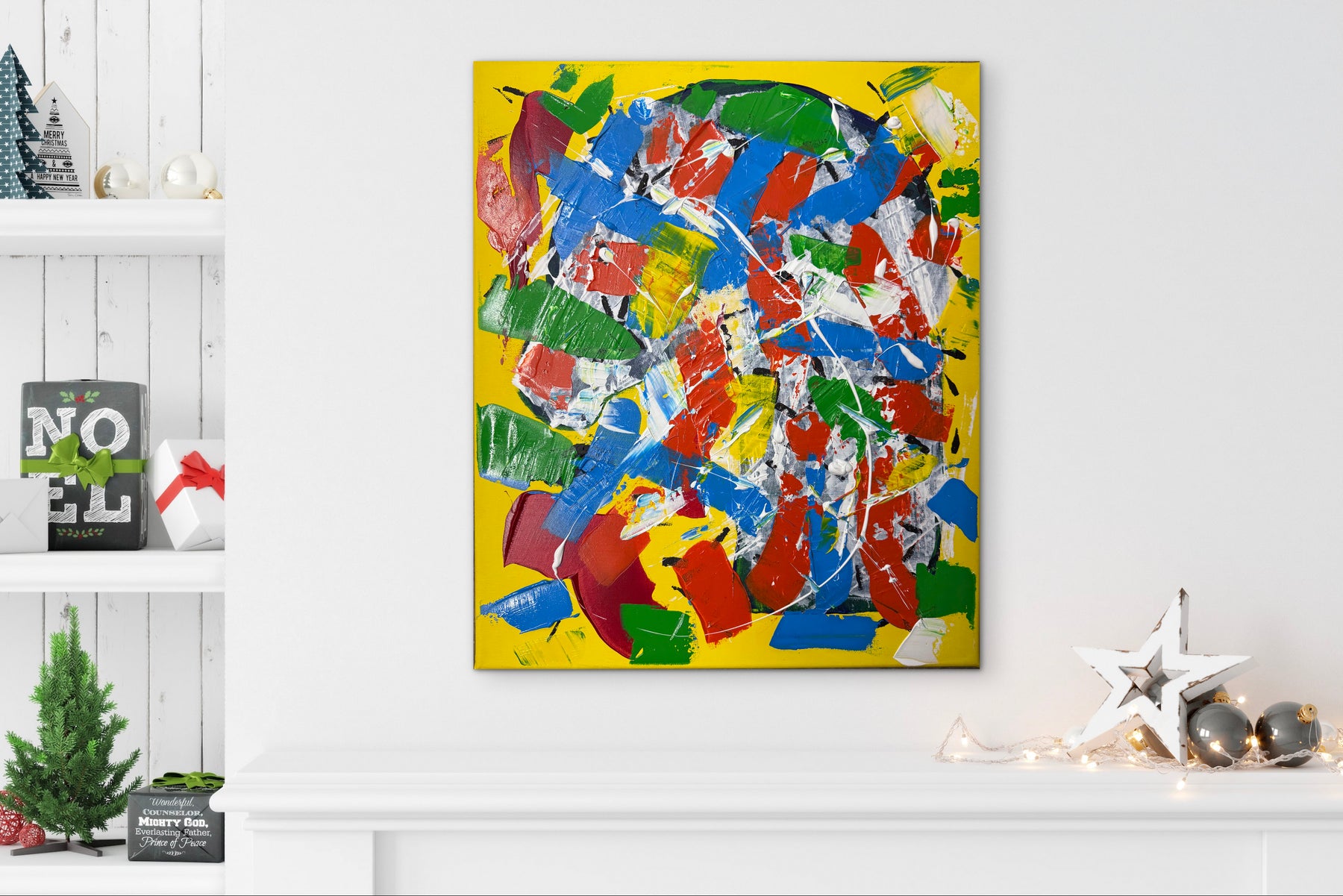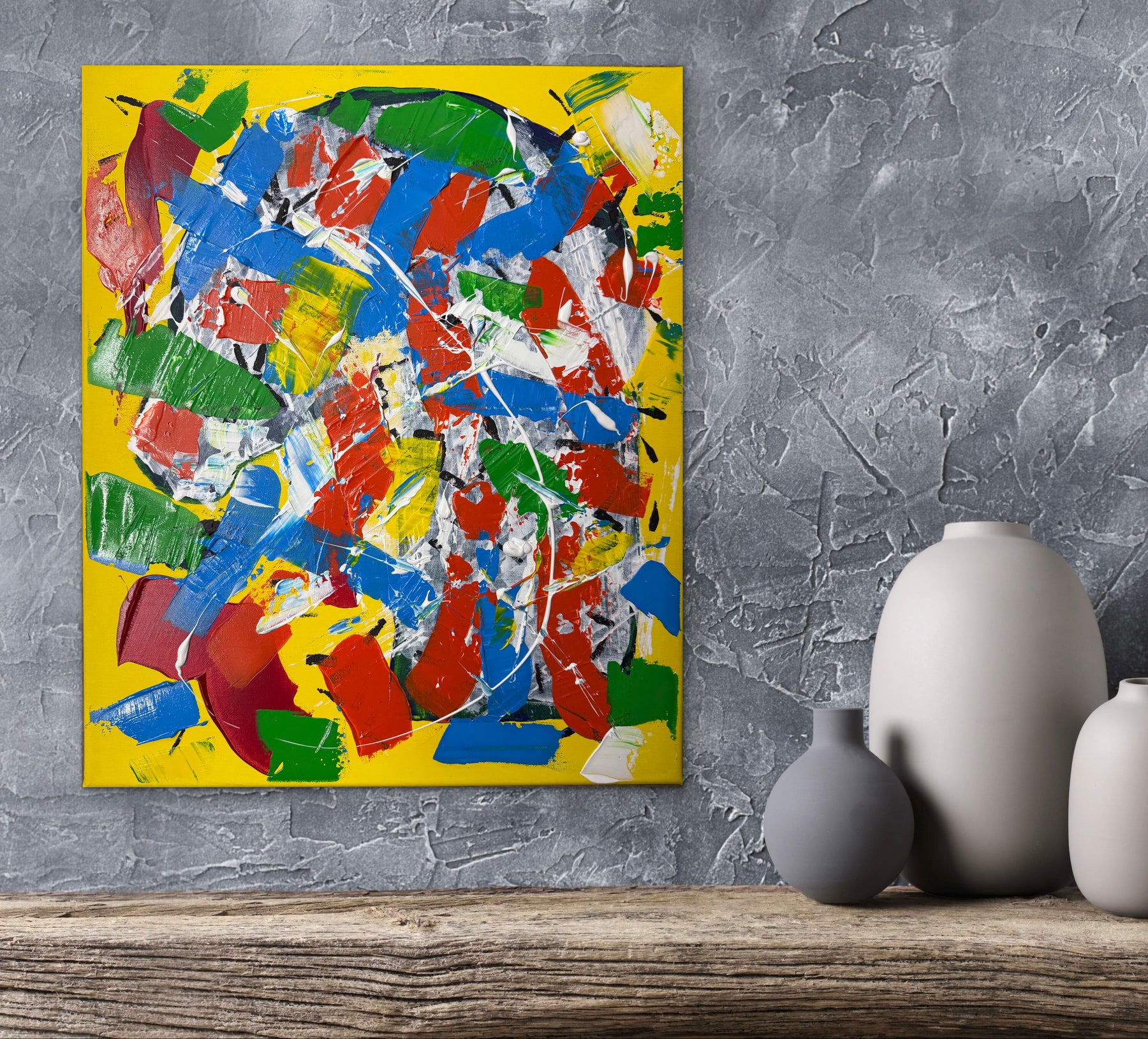 This piece features sweeping, ribbon-like strokes in vibrant green, yellow, blue, red, and black, creating a rhythmic, celebratory composition full of energy and flow. The curves and overlaps give the artwork a playful yet balanced presence, making it an uplifting focal point for any space.
